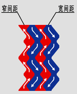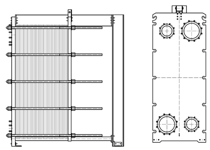 大間距不等截面板式換熱器,主要針對石油、化工、輕工、糧食深加工及造紙等行業(yè)工藝過程中高粘度且含固體顆粒的介質(zhì),普通的板式換熱器,因板間距相對較窄,介質(zhì)在板間容易堵塞。寬通道的板間距離相對較大,消除了介質(zhì)容易堵塞的不足。本品采用不等間距流道結(jié)構(gòu),以適應(yīng)和解決含固體纖維顆粒的介質(zhì)在換熱過程中易堵塞的難題,物料側(cè)通道間距16mm,是目前行業(yè)中板間距最大的可拆式換熱器,循環(huán)水側(cè)通道間距8mm,也可根據(jù)情況調(diào)整為寬-寬通道,板片波紋采用雙人字形波紋。采用扁管狀導(dǎo)流區(qū)設(shè)計(jì),使物料在進(jìn)入板間時(shí)分布更均勻,同時(shí)采用分區(qū)換熱的波紋結(jié)構(gòu),消除了普通板式換熱器的“傳熱死區(qū)”;密封墊片采用八角型密封結(jié)構(gòu),即使墊片的厚度達(dá)到20mm,板片厚度為0.8~1.0mm,耐壓能力仍能達(dá)到1.0Mpa,使設(shè)備在運(yùn)行期間更加安全可靠。